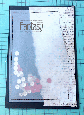 Теперь под основную композиционную карточку подкладываю вырубку и тоже прошиваю, таким образом мы фиксирем не только украшения, но и пайетки внутри кармашка.