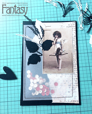 Сперва вырубаю элементы украшения открытки. Для этого мне пригодились ножи Fantasy: "Роза2"и "Жемчужные нити и тычинки для цветов". Затем подбираю подложки под главную картинку и кальку.