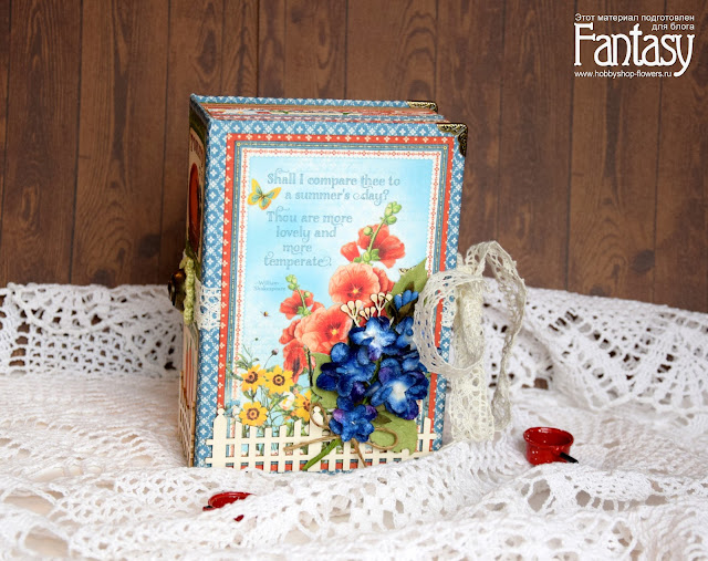 Обложку я украсила чипбордом, тканевыми бархатистыми цветочками и листочками.