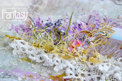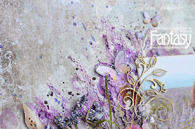 И решила я создать лаванду при помощи ножичка Fantasy "Жемчужные нити и тычинки для цветов". Я просто брала и приклеивала много-много этих веточек с жемчужинками на фон, потом все покрывала грунтом, потом красила спреями и акварелью.
