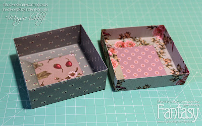 Вырезаем из скрап-бумаги квадраты со стороной 7,9 и 8,1 см и вклеиваем их в наши заготовки.