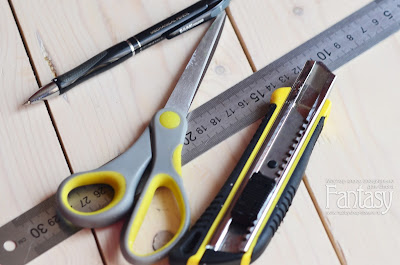 Среди инструментов стандартный набор - карандаш, нож канцелярский, линейка и ножницы: