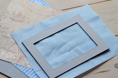 А из ткани вырезаем лоскут по размеру чуть больше нашей заготовки для рамочки: