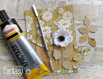 Приклеиваем цветок и листья. Составляем цветочную композицию. Она будет смещена чуть вправо. Обратите внимание на цвет листьев!