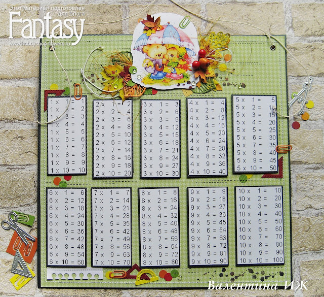 Я мама второклассника. С октября мой сын будет учить таблицу умножения. А их, оказывается, существует 2 вида: обычный - столбиками и таблица Пифагора! Как помочь ребенку запомнить таблицу умножения? Решила сделать ему над столом небольшое наглядное пособие. В его изготовлении я использовала ОЭ: канцелярия, желтый цвет, клетка (школьная клетка имеется в виду), кленовый лист, брызги/кляксы, зонт.