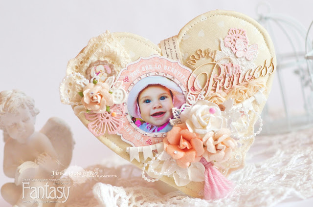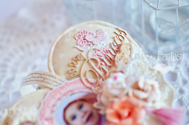В основе фоторамки переплетный картон, обтянутый тканью с использованием синтепона. Для декорирования я использовала коллекцию Sweet Girl от Bee Shabby.