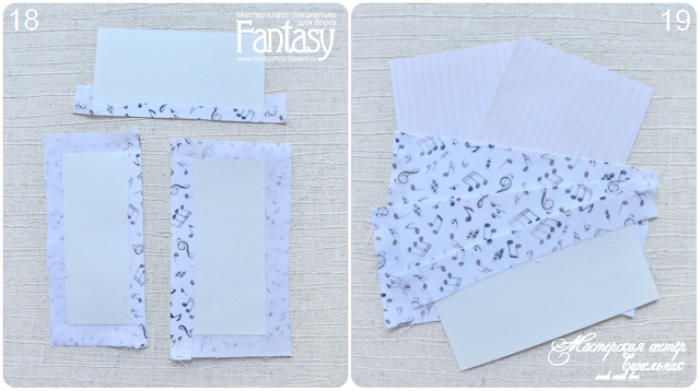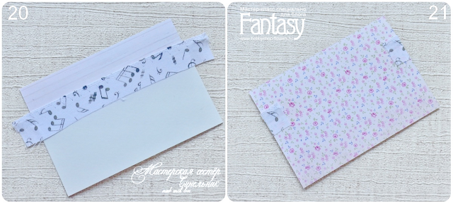 8. Начинаем делать кармашки, и сначала сделаем кармашек с двумя отделениями. Берем дизайнерский картон, приклабываем к нему, сначала полоску, где ткань только на половину. Совмещаем уголки. (20). Аккуратно переворачиваем, и хвостики ткани приклеиваем. Внимание! Смотрим, чтобы уголки не съехали. (21)