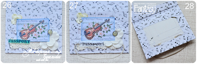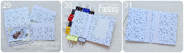 11. Начинаем собирать нашу обложку. Берем подготовленные детали (29). Приклеиваем кармашки. С той стороны, где декор приклеиваем деталь с одним кармашком. Помогаем себе канцелярскими зажимами (30). С другой стороны приклеиваем деталь с двумя кармашками. ВАЖНО! Приклеиваем кармашки так, чтобы потом можно было вставить паспорт )(31)