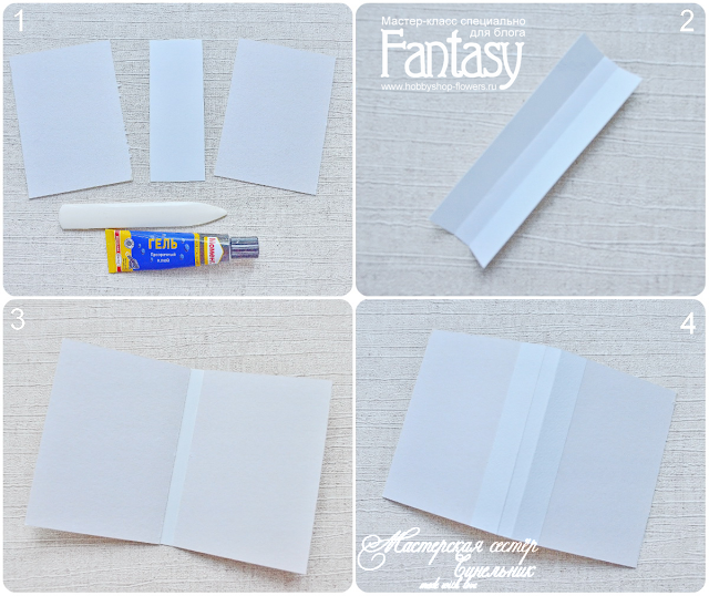 2. Берем подготовленные 2 детали пивного или переплетного картона 9,5х13,5 см и соединительную полоску 5х13,5 см. (1). Берем нашу соединительную полоску, и бигуем по 2 см от края. А в серединке остается 1 см. (2). Приклеиваем листы картона с обеих сторон полоски (3,4).