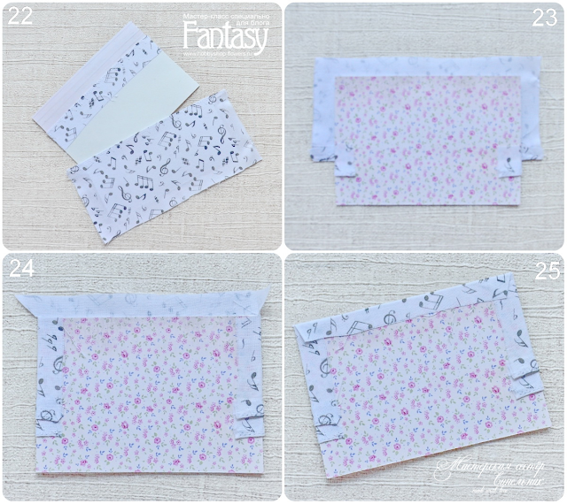 9. Продолжаем дальше. Берем полученную заготовку (21) и полоску которая поменьше (размер 13х6) (22). Складываем детали как показано на фото (23). Приклеиваем сначала короткие стороны, отрезали небольшой треугольник. (24) Подклеили уголки, и приклеиваем одну сторону (25)