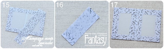 6. Берем полученную заготовку и полоску ткани для корешка. (15). Подгибаем хвостики так, чтобы в серединке получился отрезок размером около 13 см, сгибы проглаживаем. Хвостики подклеиваем, если они получились длинными, можно немного отрезать и оставить хвостик в 1 см. (16) И приклеиваем полученную полоску на корешок, помогаем себе биговочной палочкой. Проверяем, хорошо ли закрываеся обложка, так как пока клей еще не высох можно будет поправить (17).