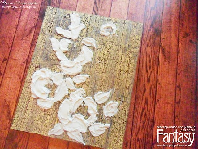 Берем текстурную пасту, мастихин, и начинаем выкладывать ее по контуру рисунка: в начале нижние слои лепестков, после того как просохнет нижний слой, начинаем выкладывать верхний слой.