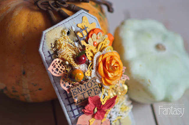 - украшения: вязаная салфетка, бумажные цветы, ягодки, декоративная надпись, дотсыи брызги краски для акцента);