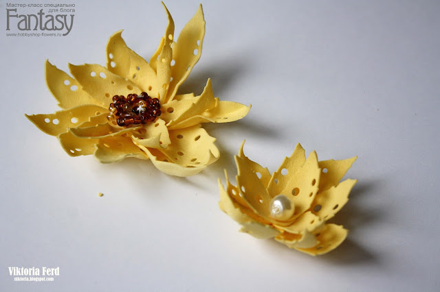 Итак, каждый лепесток из тонкого фоамирана (0,5 мм), придерживая шилом, нагрела феном для эмбоссинга. Держать недолго - как только начали загибаться - этого уже достаточно.