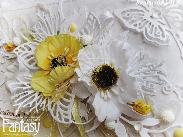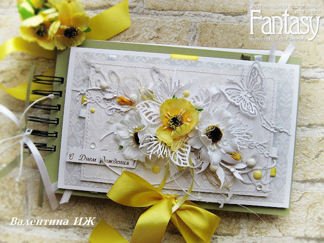 Вот такой необычный и нужный подарок получит именинница! Поздравительная открытка расположена на обложке настольного блокнота. Открытку оформила с помощью вырубки ножами FANTASY.