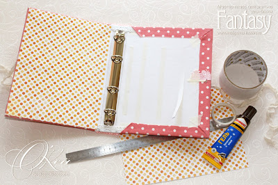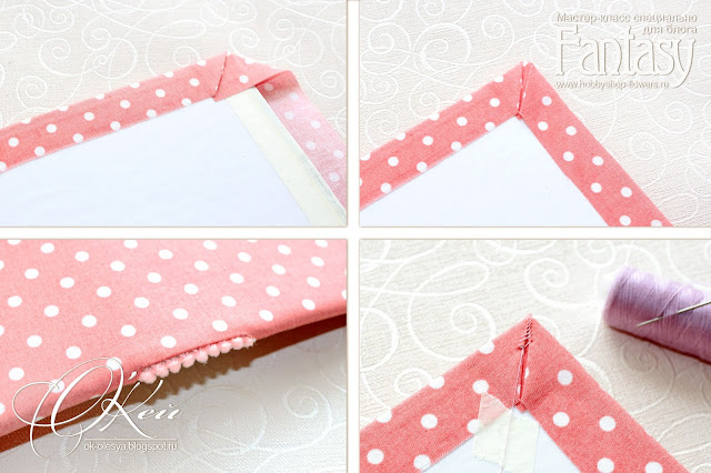 2. Если выбрана ткань просвечивающая, а обложка тетради темная - края крашу белым акрилом или заклеиваю бумажным скотчем. Некрасиво - когда под нежным розовым темнота проглядывает!