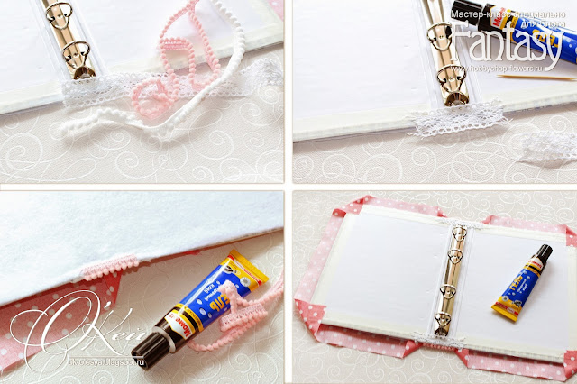 5. До обтягивания основы тканью я прячу края торца тетради под хлопковым кружевом. Пользуюсь густым клеем! Затем с флисовой стороны приклеиваю "каптал" - им у меня служит тесьма с помпошками (размер ровно по торцу). Каптал приклеивать не обязательно - хлопковой тесьмы может быть достаточно!!!