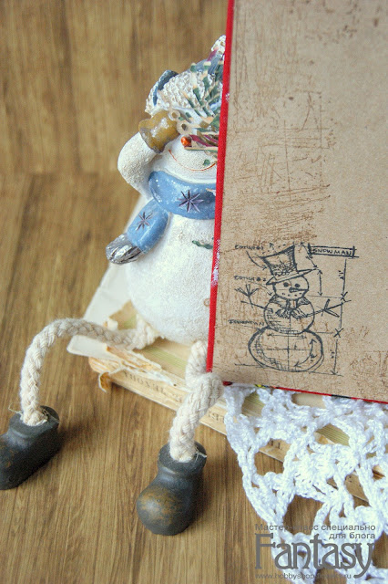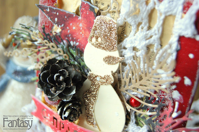 Комбинирую декор на основе открытки. Покрываю глитером элементы снеговика.