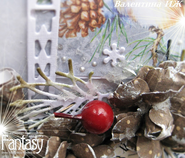 Веточки сосны чуть подтонировала дистрессом. На окно, веточки и цветы упал искусственный снег, лед. Жаль, что фото не может передать этот леденящий блеск.(((