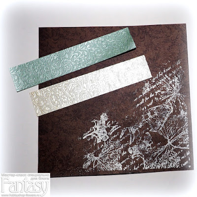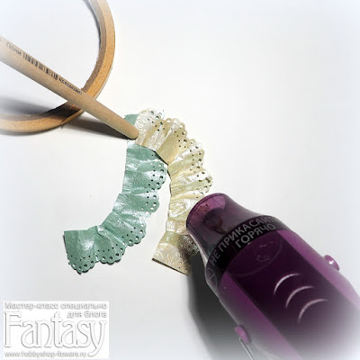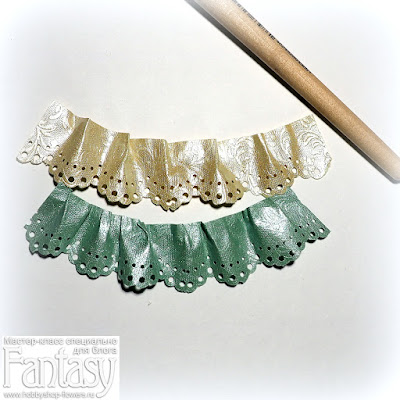 Кроме кружева решила добавить бумажные рюши. Отрезала две полоски бумаги. Не знаю, как она называется, мне ее предоставил наш интернет-магазин "Fantasy, но она чудесна! Словно шелковая, с эмбоссированным рисунком, тонкая, но прочная.