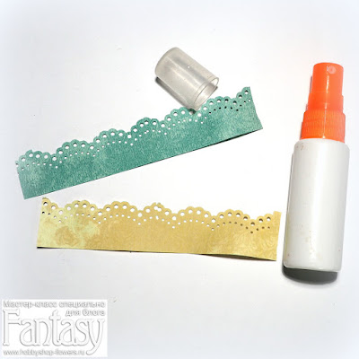 Знаете как делать бумажные рюши? Не пробовали? Значит так... Полоски бумаги пшикаем водой, если перестарались, промокните салфеткой, бумага должна быть влажной, но не мокрой. Кстати, бутылочка на фото от какой-то детской ерунды, типа сока, которую дети в рот брызгают. Очень удобно! И мой мини-мист от ТХ скончался после того, как я по совету какой-то мастерицы, попыталась распылить спрей, сделанный самостоятельно из разведенной акриловой краски. Если кто такое еще не пробовал - не делайте! Может, это только у меня, но он забился так, что осталось только выбросить.