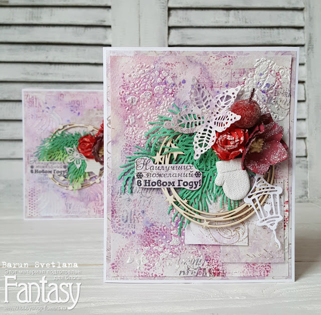 Для вашего вдохновения я сделала две открытки с самодельным фоном: штампы, спреи, паста и пудра для эмбоссинга..