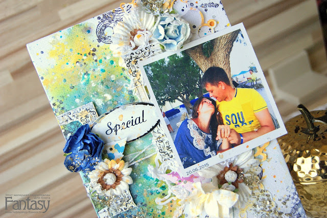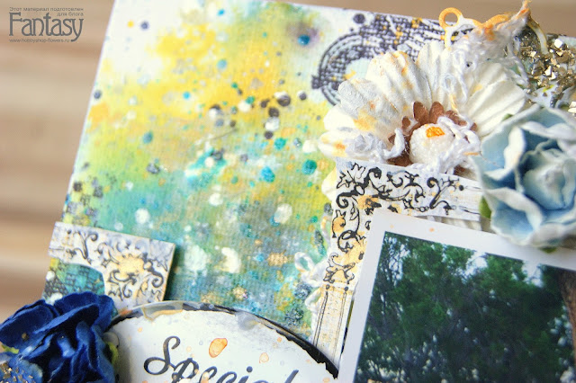 Фон сделан с помощью спреев, штампов, брызг. В композиции использованы цветы, кружево, вырубка, шнур, рамочка, золотые хлопья. И наша семейная фотография!