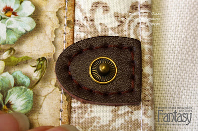 23. Когда всё пришили, берём кожаную застёжку и пришиваем одну часть к передней части обложки. Я эту часть застёжки пришиваю на руках при помощи иголки и нитки.