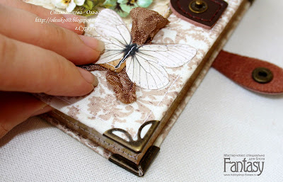 21. Теперь наши внутренние заготовки убираем в сторону, достаём заготовку обложки и украшение (картинки, шебби-ленту) и кожаную застёжку. Переходим к декорированию обложки.