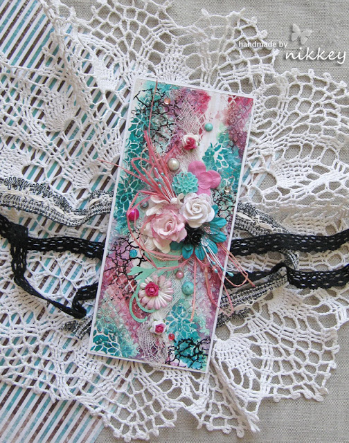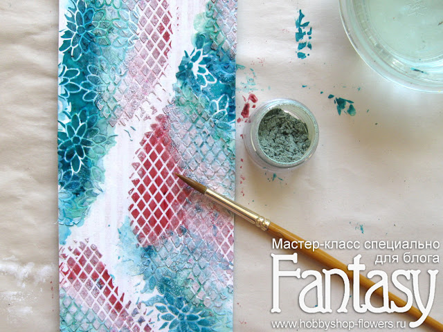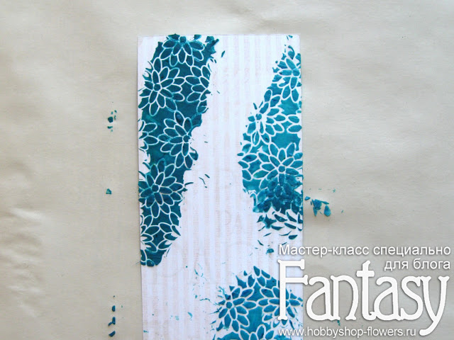Бирюзовый цвет я наношу через трафарет "Peony Blossoms". Пока выглядит не очень аккуратно, да? Но это ничего. Как говорил мой художественный руководитель в студии: "Плох тот художник, который не умеет исправлять свои ошибки"))