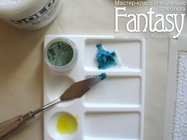 Я размешиваю порошковую краску с гелем до однородности. Вы можете брать любые краски и медиумы, которые у вас есть: акварель, акрил, текстурные пасты... Можно тщательно не размешивать и сделать неравномерное окрашивание, получится интересный эффект. У меня в данном случае матовый гель, но если вы возьмете глянцевый, цвета будут ярче.