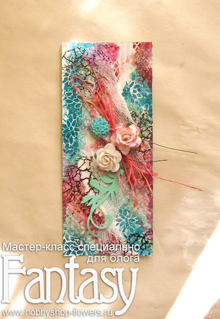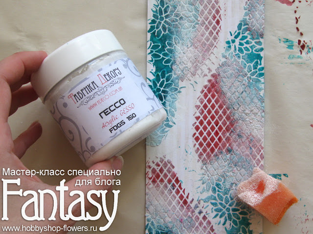 Я забыла сфотографировать промежуточный результат, но могу сказать, что мне не понравились яркие участки, которые получились в результате наложения двух цветов. Поэтому я их заштамповала губкой с белым гессо. И также прошлась белым по краям цветных участков. Так смотрится гораздо гармоничнее.