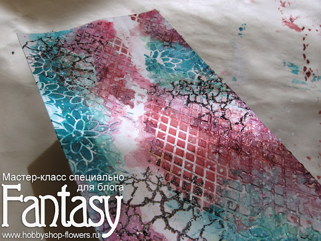 3). Такие фоны я люблю усложнять штампами. Я взяла две пудры для эмбоссинга. Трещинки сделала черной пудрой Super Fine Detail, а второй узор покрыла полупрозрачной розовой пудрой.