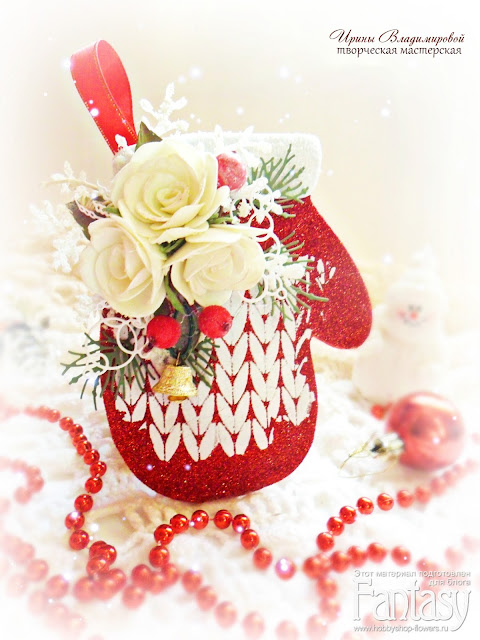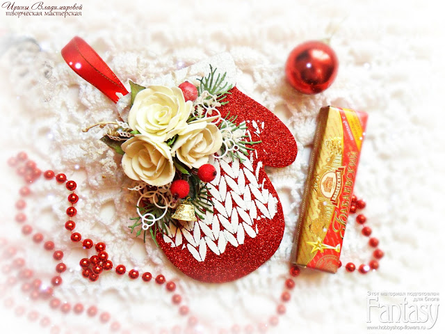 За основу я взяла глиттерный фоамиран, а верх варежки украсила махровым фоамираном, нанесла с помощью трафарета и текстурной пасты орнамент. Так же украсила цветами из фоамирана, добавила сахарные ягодки, ну и конечно, не обошлось без вырубки ножами Fantasy: "Сосна + нити 3", "Фонари чудес и волшебства", "Жемчужные нити и тычинки для цветов".