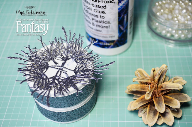 Из кардстока сделала вырубку сосновых веточек и полосками украсила основу коробочки...