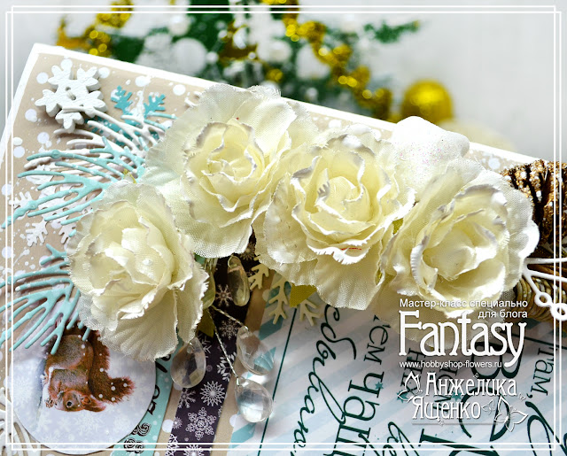 Пока заготовку отставляем. Осталось задекорировать крышку. Основные элементы для композиции у меня вот такие: веточки, цветы, карточка, тэг, пуговички-снежинки.