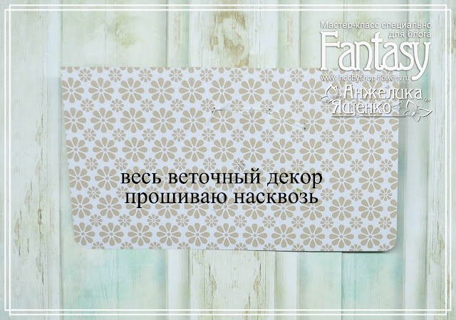 После этого деталь из скрап-бумаги с прошитым декором фиксирую на заготовке-конверте.