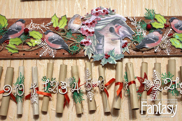 На моем календаре птички едят ягодки, сидя на веточках, которые я сделала с помощью вырубки ножами FANTASY: "Сосна + нити 3" и "Веточка смородинка".