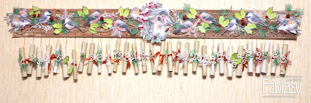 Планка готова к декорированию. Все рисунки я вырезала и наклеила на кусочки переплетного картона, чтобы придать объем, добавила вырубку, раскрашенный и вырезанный штамп "остролит", наклеила полужемчуг, чтобы изображения ягод получились объемными, завитки из бечевки, и расставила акценты с помощью искусственного снега.