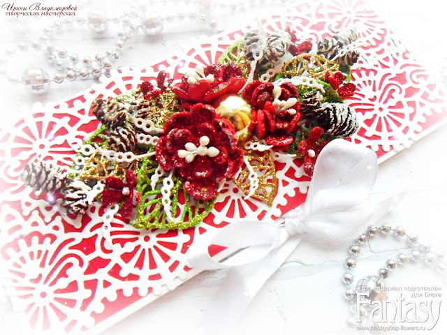 Сделала цветы из глиттерного фоамирана, добавила листики, которые придают композиции праздничный акцент, и дополнила вырубкой "Жемчужные нити и тычинки для цветов".